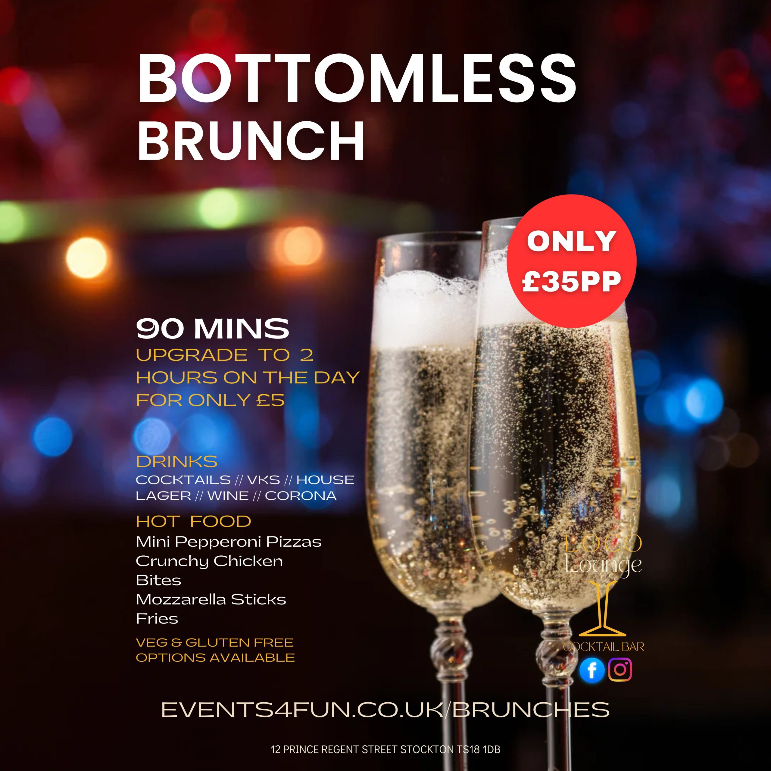 Our bottomless brunches are £35pp. A non-refundable deposit of £10pp is required. Remaining balance to be paid on arrival. You can upgrade on the day to 2 hours for only £5. Friday Slots – 6pm // 8pm Saturday Slots – 2pm // 4pm // 6pm // 8pm Please select Date, Time and Total Number attending then Add to cart.